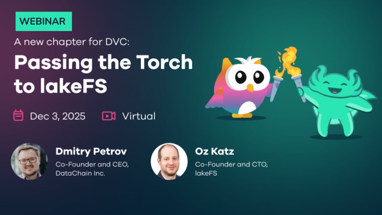 DVC and lakeFS have always shared a mission: to treat data with the same precision and reliability as code. DVC has empowered data scientists with seamless versioning and reproducibility, while lakeFS has brought Git-like workflows to massive datasets and enterprise pipelines. Now, under one roof, we’re bridging the gap from experimentation to production, from local model exploration to global AI infrastructure. Join us as DVC founder Dmitry Petrov and lakeFS co-Founder Oz Katz discuss this transition Additional Resources: Dmitry’s Blog post: https://dvc.org/blog/a-shared-vision-for-the-future-of-dvc/ FAQ’s Blog post: https://dvc.org/blog/dvc-joins-lakefs-your-questions-answered/ Einat Orr’s Blog post: https://lakefs.io/blog/celebration-shared-vision-lakefs-dvc/ Need to Open an Issue? https://github.com/treeverse/dvc/issues